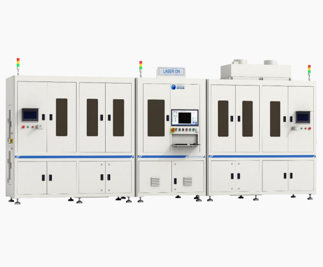 本设备配备高速振镜光学系统,对镀膜硅片四周多余膜层进 行清除,旋转加工平台和视觉对位等系统有效保证设备节拍 和精度,自动上下料结构满足联线量产需求。