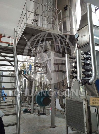 空气经过滤和加热,进入干燥器顶部空气分配器,热空气呈螺旋状均匀地进入干燥室。料液经塔体顶部的高速离心雾化器,(旋转)喷雾成极细微的雾状液珠,与热空气并流接触在极短的时间内可干燥为成品。成品连续地由干燥塔底部和旋风分离器中输出,废气由风机排空。