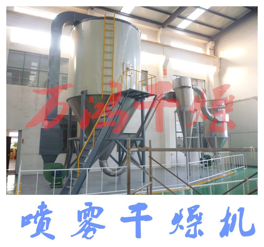 空气经过滤和加热,进入干燥器顶部空气分配器,热空气呈螺旋状均匀地进入干燥室。料液经塔体顶部的高速离心雾化器,(旋转)喷雾成极细微的雾状液珠,与热空气并流接触在极短的时间内可干燥为成品。成品连续地由干燥塔底部和旋风分离器中输出,废气由风机排空。