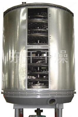 湿物料自加料器连续地加到干燥器上部**层干燥盘上,带有耙叶的耙臂作回转运动使耙臂作回转运动使耙叶连续地翻抄物料。物料沿指数螺旋线流过干燥盘表面,在小干燥盘上的物料被移送到外缘,并在外缘落到下方的大干燥盘外缘,在大干盘上物料向里移动并从中间落料口落如下一层小干燥盘中。大小干燥盘上下交替排列,物料得以连续地流过整个干燥器。中空的干燥盘内通入加热介质,加热介质形式有饱和蒸汽、热水和导热油,加热介质由干燥盘的一端进入,从另一端导出。已干物料从*后一层干燥盘落到壳体的底层,*后被耙叶移送到出料口排出。湿份从物料中逸出,由设在顶盖上的排湿口排出,真空型盘式干燥器的湿气由设在顶盖上的真空泵口排出。从底层排出的干物料可直接包装。通过配加翅片加热器、溶剂回收冷凝器、袋式除尘器、干料返混机构、引风机等辅机,可提高其干燥的生产能力,干燥膏糊状和热敏性物