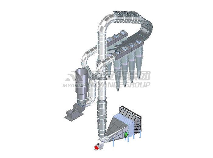 湿物料自加料机连续地加到干燥器上部**层干燥盘上,带有耙叶的耙臂作回转运动使耙臂作回转运动使耙叶连续地翻抄物料。物料沿指数螺旋线流过干燥盘表面,在小干燥盘上的物料被移送到外缘,并在外缘落到下方的大干燥盘外缘,在大干盘上物料向里移动并从中间落料口落如下一层小干燥盘中。大小干燥盘上下交替排列,物料得以连续地流过整个干燥机。中空的干燥盘内通入加热介质,加热介质形式有饱和蒸汽、热水和导热油,加热介质由干燥盘的一端进入,从另一端导出。已干物料从后一层干燥盘落到壳体的底层,后被耙叶移送到出料口排出。湿份从物料中逸出,由设在顶盖上的排湿口排出,真空型盘式干燥机的湿气由设在顶盖上的真空泵口排出。从底层排出的干物料可直接包装。通过配加翅片加热器、溶剂回收冷凝器、袋式除尘器、干料返混机构、引风机等辅机,可提高其干燥的生产能力。干燥膏糊状和热敏性物料时,可方便地回收溶剂,并能进行热解和反应操作。