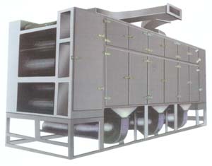 | 概述 该机是我厂首创的穿流连续式干燥设备,用于透气较好的片状、条状、颗粒状物料的干燥,对于脱水蔬菜、中药饮片等类含水率高、而物料温度不允许高的物料尤为合适;该系列干燥机具有干燥速度快、蒸发强度高、产品质量好的优点,对脱水滤饼类的膏状物料,需经造粒或制成条状后亦可干燥。 原理 物料由加热器均匀地铺在网带上,网带一般采用12-60目不锈钢丝网,由传动装置拖动在干燥机内移动。干燥机由若干单元组成,每一单元热风独立循环,部分尾气由专门排湿风机排出,废气由调节阀控制,热气由下往上或由上往下穿过铺面物料的网带完成热量与物料传递的进程,带走物料水分。网带缓慢移动,运行速度可根据物料温度自由调节,干燥后的成品连续落入收料器中。上下循环单元感觉用户需要可灵活配备,单元数量可根据需要选取。 |