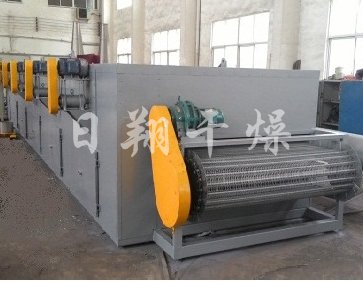 物料由加料器均匀地铺在网带上,网带一般采用12-60目不锈钢丝网,由传动装置拖动在干燥机内移动。干燥机由若干单元组成,每一单元热风独立循环,部分尾气由专门排湿风机排出,废气由调节阀控制,热气由下往上或由上往下穿过铺满物料的网带完成热量与质量传递的进程,带走物料水份。网带缓慢移动,运行速度可根据物料温度自由调节,干燥后的成品连续落入收料器中。上下循环单元根据用户需要可灵活配备,单元数量亦可根据需要选取。