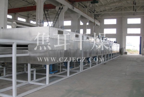物料由加料器均匀地铺在网带上,网带一般采用12-60目不锈钢丝网,由传动装置拖动在干燥机内移动。干燥机由若干单元组成,每一单元热风独立循环,部分尾气由专门排湿风机排出,废气由调节阀控制,热气由下往上或由上往下穿过铺满物料的网带完成热量与质量传递的进程,带走物料水份。网带缓慢移动,运行速度可根据物料温度自由调节,干燥后的成品连续落入收料器中。上下循环单元根据用户需要可灵活配备,单元数量亦可根据需要选取。