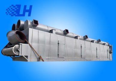 将所要处理的物料通过适当的铺料机构,如星型布料器、摆动带、粉碎机或造粒机,分布在输送带上,输送带通过一个或几个加热单元组成的通道。每个加热单元均配有空气加热和循环系统,每一个通道有一个或几个排湿系统,在输送带通过时,热空气从上往下或从下往上通过输送带上的物料、从而使物料能均匀干燥。