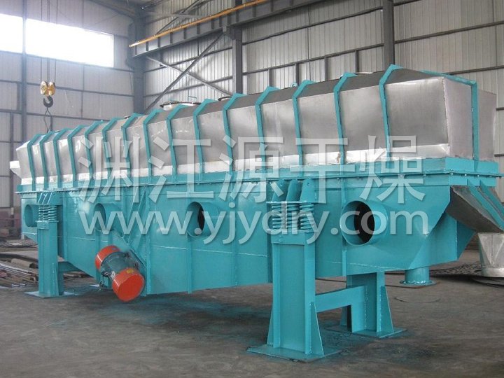 物料自进料进口进入机内,在振动力作用下,物料沿水平面流化床抛掷,向前连续运动,热风向上穿过流化床同湿物料换热后,湿空气经旋风分离器除尘后由排风1:3排出.干燥物料由排料进口排出。