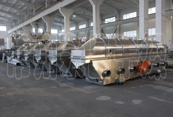 物料自进料口进入机内,在振动力作用下,物料沿水平方向抛掷向前连续运动。热风向上穿过流化床和湿物料换热,湿空气经旋风分离器除尘后由排风口排出,干燥物料由排料口排出。