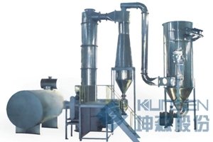 干粉随气流进入旋风收集器,成品由收集器底部出料排出,尾气中夹带的细粉通过脉冲布袋除尘器进一步过滤分离,净化后的尾气由引风机排除。旋转式闪蒸干燥机具有适应物料范围广,能处理膏状滤饼,生产能力大,连续密闭操作以及干燥物料一次成粉等优点。由于设计了独特的破碎机构和进料装置,使得物料在干燥器内能以*短时间分散,强化了传热效果,使热效率达65%。