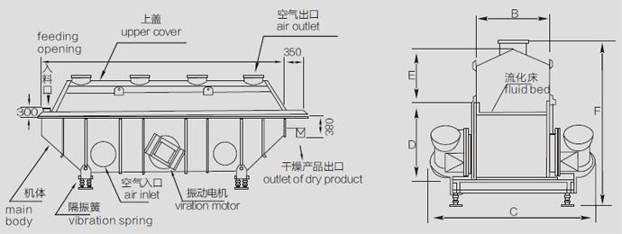 物料自进料进口进入机内,在振动力作用下,物料沿水平面流化床抛掷,向前连续运动,热风向上穿过流化床同湿物料换热后,湿空气经旋风分离器除尘后由排风1:3排出.干燥物料由排料进口排出。