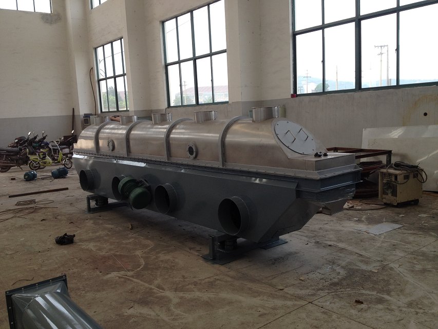 物料自进料进口进入机内,在振动力作用下,物料沿水平面流化床抛掷,向前连续运动,热风向上穿过流化床同湿物料换热后,湿空气经旋风分离器除尘后由排风1:3排出.干燥物料由排料进口排出。