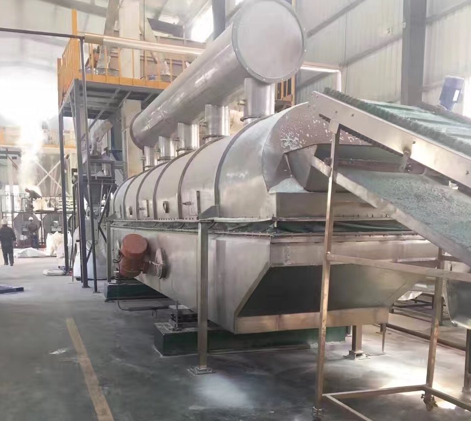 物料自进料进口进入机内,在振动力作用下,物料沿水平面流化床抛掷,向前连续运动,热风向上穿过流化床同湿物料换热后,湿空气经旋风分离器除尘后由排风1:3排出.干燥物料由排料进口排出。