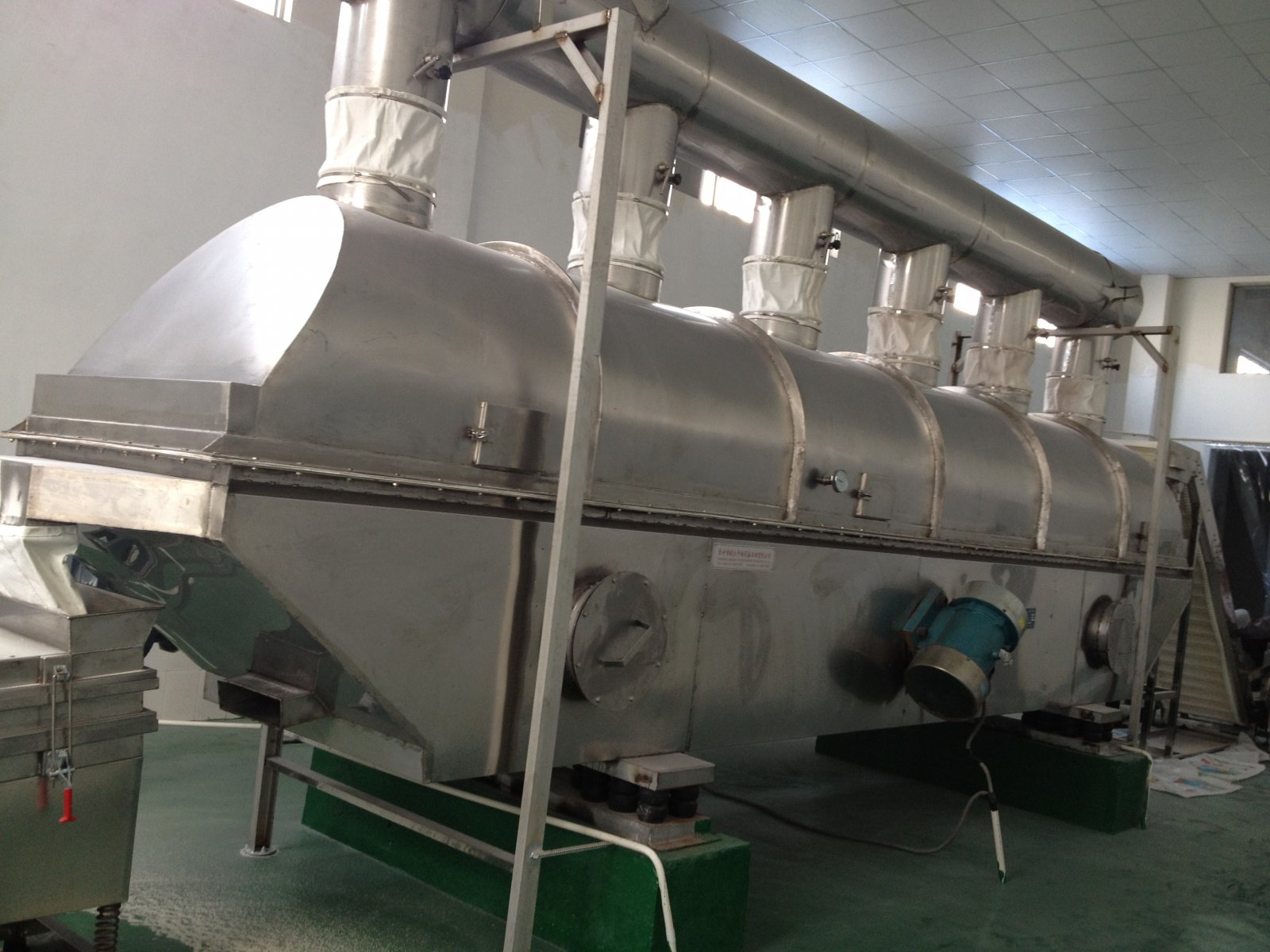物料自进料进口进入机内,在振动力作用下,物料沿水平面流化床抛掷,向前连续运动,热风向上穿过流化床同湿物料换热后,湿空气经旋风分离器除尘后由排风1:3排出.干燥物料由排料进口排出。