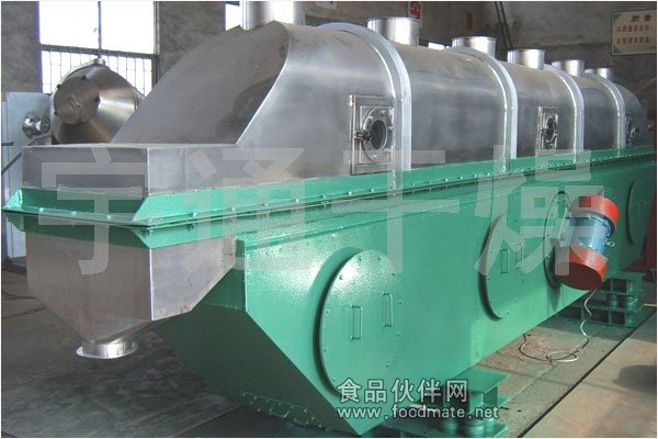 物料自进料进口进入机内,在振动力作用下,物料沿水平面流化床抛掷,向前连续运动,热风向上穿过流化床同湿物料换热后,湿空气经旋风分离器除尘后由排风1:3排出.干燥物料由排料进口排出。