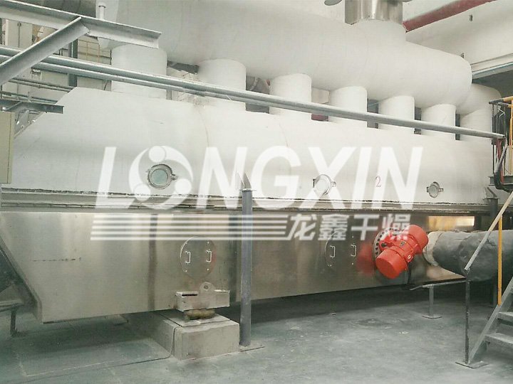 4、物料在空气分布板上跳跃前进,经均风的热气流双重作用下,强化传热和传质过程,由排料口排出干燥后的产品。蒸发出的水份和废气经旋风分离器回收粉尘,排入大气。物料前进速度均匀、快速,无漏料现象。在冷却系统中,可采用了冷冻除湿装置,对进风进行强制冷却并除湿,确保物料冷却效果,并可很好的防止冷却过程中回潮现象的发生。