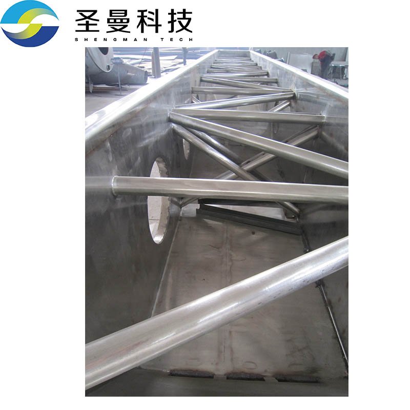 产品在干燥过程中,物料的含水率、粒子重量、床层堆料厚度是沿床面方向逐渐减少的,因此各干燥阶段筛板的孔径、孔数(开孔率)及所需风量、风压也应该是相应变化的。采用分室操作可以结合物料的干燥特性来调整各分室的风量、风压从而达到有效控制产品在流化床床板上的运行状态及干燥效果。我公司生产的硫铵专用振动流化床干燥机在设备主机上分成3个室,分别设计为预干段、干燥段、冷却段。烧结厂、电厂脱硫所用硫铵干燥机预干段设计长度为4米(此数据也为我公司根据用户使用情况得出的经验数据),因为该工艺下硫铵颗粒小、原始水分相对较高,硫铵须经过4米长的强制干燥方可充分散开且无明显结团现象。物料进入预干燥段时,由于产品的含水量较高、且有报团现象,此时需要用高温大风量对其进行强制干燥,使其迅速去掉表层水从而散开。该段穿孔速度设计为24m/s,床板采用冲孔板,冲孔直径为φ3,开孔率为3%。进入干燥段的硫铵产品已能基本均匀分布在床板上,而且能逐渐进入沸腾状态。此时的硫铵颗粒除去内部水已不是问题,该段设计的关键是控制床板的穿孔速度不能太高使已被干燥好的硫铵小颗粒在排风机负压的带动下向外排出,也不能采用过低的穿孔速度使已被干燥好的硫铵小颗粒掉入设备主机下腔体。烧结厂、电厂脱硫所用硫铵干燥机干燥段长2.5米,设计穿孔速度为16m/s,为更有效控制硫铵颗粒掉入设备下腔体,该段筛板形式采为栅状编织板,此筛板的缝隙可控制在200?m左右,开孔率为5-6%。冷却段长度均为1.5米,床板的开孔形状、开孔率及设计穿孔速度都与干燥段同。