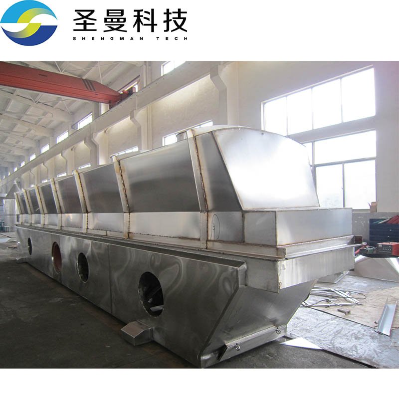 因振动流化床干燥机是一种振动机械,所以它的结构直接影响着流化床的使用寿命,而目前国内厂家生产的振动流化床全部为箱式结构,中小型床采用这种结构是可以的,但大型床采用这种结构就会出现很多问题,普遍表现为振槽刚度和强度不足,易开焊、断裂,对地基动载荷冲击较大等,从而导致物料干燥时产生偏振、物料不向前走、出来的产品水份不均匀等现象。为了解决这一问题我们的硫铵专用干燥机采用了框架结构。框架结构,承载由框架完成,设备在未成形振槽前,单独的框架就可参振,这样就使振槽质量减少,从而使动负荷减少。另外,由于框架结构是依据机械振动学和弹性力学设计的,能够完全满足振槽的刚度和强度要求,从我公司大型流化床目前市场使用效果看,这种结构是得到肯定的,明显优于箱式结构。箱式结构运行过程中易产生偏正、乱振,而框架结构由于刚性强度好,就不会出现这类现象。