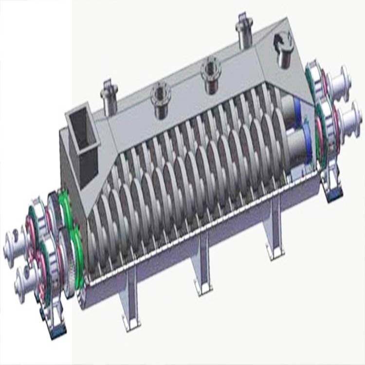 空心轴上密集排列着楔型中空浆叶,热介质经空心轴流经浆叶。单位有效容积内传热面积很大,热介质温度从-40℃到320℃,可以是水蒸汽,也可以是液体型:如热水、导热油等。间接传导加热,没有携带空气带走热量,热量均用来加热物料。热量损失仅为通过器体保温层向环境的散热。楔型浆叶传热面具有自清洁功能。物料颗粒与楔型面的相对运动产生洗刷作用,能够洗刷掉楔型面上附着物料,使运转中一直保持着清洁的传热面。浆叶干燥机的壳体为Ω型,壳体内一般安排二到四根空心搅拌轴。壳体有密封端盖与上盖,防止物料粉尘外泄而充分发挥作用。