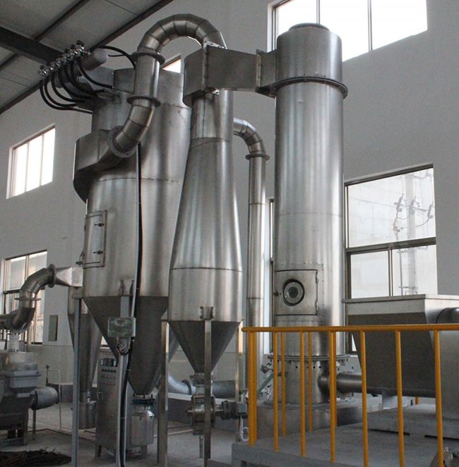 脱水后的干物料随热气流上升,分级环将大颗粒截留,小颗粒从环中间排出干燥器外,由旋风分离器和除尘器回收,未干透或大块物料受离心力作用甩向器壁,重新落到底部被粉碎干燥。