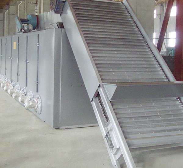 带式烘干机是利用传输带运载物料进行连续烘干的干燥设备,适宜流水作业。其工作原理是所要处理的物料通过适当的铺料机构,如星型布料器、摆动带、粉碎机或造粒机,分布在输送带上,输送带通过一个或几个加热单元组成的通道,每个加热单元均配有红外加热和空气循环系统。