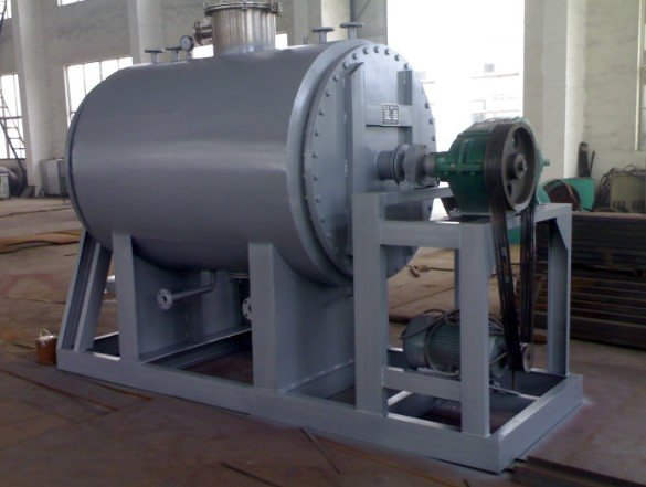本机是一种新颖卧式间歇式真空干燥设备,湿物料经传导蒸发,带有刮板搅拌器不断清除热面上的物料,并在容器内推移形成循环流,水份蒸发后由真空泵抽出。