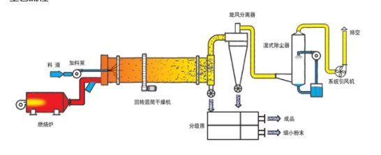 喷浆造粒回转圆筒干燥系统是由烟气/热风热源(燃煤、燃油、燃气、蒸汽、电)、回转圆筒干燥主机、溶液/熔融液雾化系统、分离设备(旋风分离器+湿式除尘器、多级旋风分离器)、风机、筛分、控制系统等组成。只可进行连续操作。是在老式回转圆筒干燥机内增加了液体雾化系统,增加了常规回转圆筒的产品形状范围。目前广泛应用于:复合肥造粒、有机肥造粒、生活污泥造粒干化。