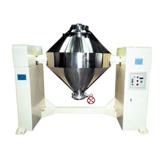二个圆锥形容器组合而成,圆锥形的顶角根据粉体的安息角进行设计,标准型为90度。物料的运动轨迹和V型混合设备类似,在重力和离心力的作用下,反复分离,集合进行混合。对具有流动性的物料比较适合。相比V型混合设备,在混合时间上有所延长,但是混合的效果会更好。