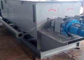 气力与机械复合式混料机在装有搅拌轴、叶片搅拌箱体底部,装备带有透气的层的充气箱。充气箱由罗茨鼓风机鼓入高压空气、物料进入搅拌箱后,首先受搅拌箱底部充气箱的气化作用而流态化,之后由搅拌箱中搅拌轴叶片的作用而充分搅拌,由于出料口在搅拌箱的上部,经搅拌后的物料从出料口溢出。出料口以下的物料则与后续的进入搅拌箱内的物料再进行搅拌后经出料口溢出。由于搅拌箱内物料充分流态化,加上物料的溢出结构,物料的粒状物(渣子)将沉积在搅拌箱底部。待混料机工作到一定时间需停机时,从搅拌箱侧面下部的清渣口清出。