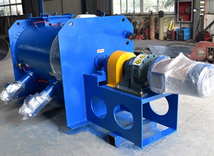 犁刀式混合机由圆形筒体、传动机构、犁刀、飞刀四部分组成;工作时,犁刀做圆周运动,物料被犁刀刀面分流成两个方向形成双向物料流,与两侧犁刀分流过来的物料相互交叉形成对流,当物料流经高速飞刀时又被高速飞刀叶片剪切和抛洒,从而在较短时间内达到均匀混合。本机的混合精度高,混合时不产生离析,尤其对于容易团聚的物料,可以起到解聚和打散的作用。