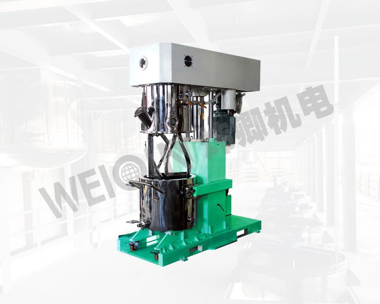 行星搅拌机通 常包含两个搅拌桨叶和两个高速分散一个刮壁桨叶,双搅拌浆和安装于高速分散轴上的多个锯齿状分散盘既作自转,又作公转;同时结合搅拌浆的低间隙设计,无死角,低速搅拌桨强烈的捏合干涉运动和和上下/左右循环运动,以及分散盘的高速剪切打散作用,两个行星搅拌桨叶绕公共轴沿容器壁运转的同时又围绕自身的轴心旋转,桨叶绕容器内壁旋转前进,不断带走容器壁上的物 料,并将物料带向中间,运转一圈后,桨叶已经过了整个容器,3圈后大部分物料已被充分混合,仅36圈后,全部物料就被完全混合均匀,配有真空装置,使物料在混合过程中无空气状态,更好的保证物料的品质