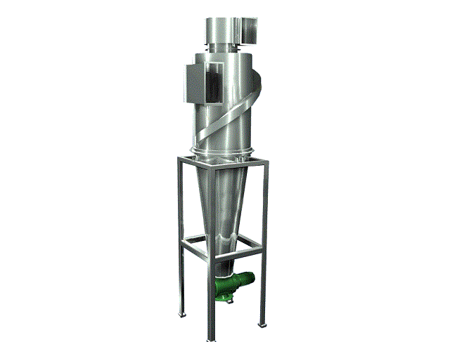 含尘气体从进口处切向进入后,气体在获得旋转运动的同时,气流分成上、下分开,形成双旋涡运动,粉尘在排气底部即双旋涡的分界处产生强烈的分离作用。较细较轻的尘粒由上部旋涡气流带往上部,在顶盖下面形成强烈旋转的灰环,产生尘粒的聚集,并被从特设的旁路分离室上部洞口引出,进旁路分离室下部螺旋槽,从除尘器外壁回风口切向引入除尘器筒体下部与内部气流汇合,粉尘被分离而落入灰斗。另一部分较粗重的粉尘颗粒则在下旋涡气流带动下,沿除尘器下段经由上旋涡气流的类似过程,将粉尘分离并进入灰斗。