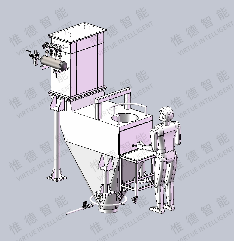 该设备内部安装过滤器清洁装置及排风扇,用于将投料过程中产生的粉尘滤除,并将洁净尾气排入大气,使人工能在清洁的环境中轻松地工作;可实现吨包投料、小包装袋投料同时进行投料。