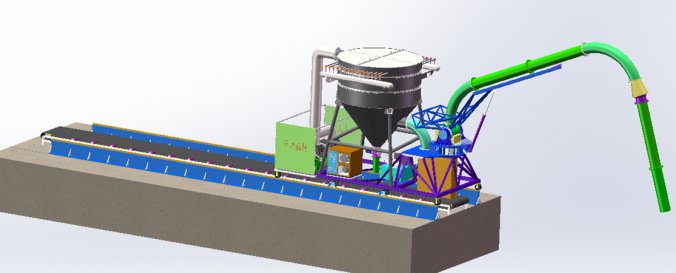 在码头建纵向路规,路规做基础预制件,在规道上建移动式大型吸料机,规道底部建有皮带机,吸送机移动范围(船宽)8米。横吸臂10米立柱旋转并加装平衡配重,横吸臂可以作弧线升降运动。竖吸臂8米制作重力自垂机构。三台132KW风机同时抽气作功。通过大型除尘器连接吸送管路,产生稳定的高速吸气流,把船里的石料吸入至除尘器下,由除尘器气料分离,石料经过三道船闸,自沉落至底部皮带机上,完成整个作业。