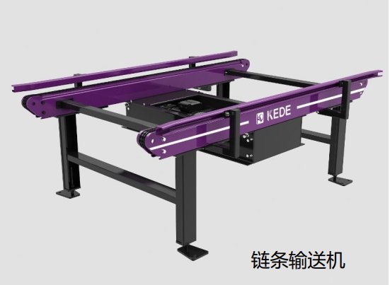 链条输送机的输送能力大,主要输送托盘、大型周转箱等。输送链条结构形式多样,并且有多种附件,易于实现积放输送,可用做装配生产线或作为物料的储存输送。