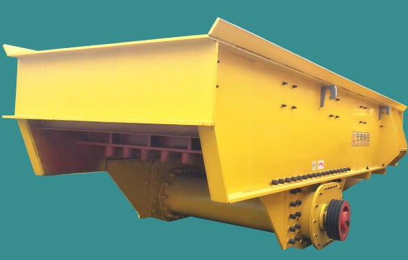 振动给料机是由给料槽体、激振器、弹簧支座、传动装置等组成。由于运用了机械振动学的共振原理,双质体在低临界近共振状态下工作,因而耗电少矿山用的振动给料机用于把物料从贮料仓或其它贮料设备中均匀或定量的供给到受料设备中,是实行流水作业自动化的必备设备。槽体振动给料的振动源是激振器,激振器是由两根偏心轴(主、被动)和齿轮副组成,由电动机通过三角带驱动主动轴,再由主动轴上齿轮啮合被动轴转动,主、被动轴同时反向旋转,使槽体振动,使物料连续不断流动,达到输送物料的目的。